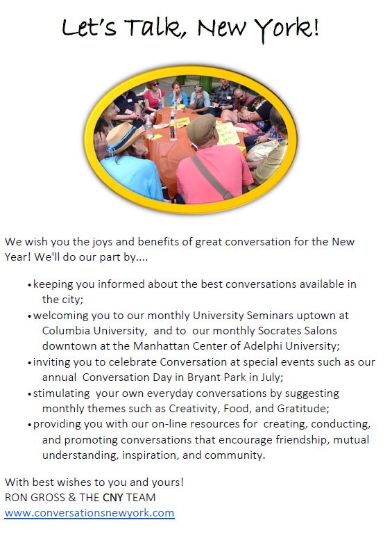 Conversations will take place in a myriad of public venues, anchored by a TED-New York Salon facilitated by Ron Gross on Fri., Jan. 15th at 5:00 at The Olivia, 315 West 33rd Street, and a CNYConversation hosted by Gross at the Manhattan Center of Adelphi University, 75 Varick Street, on Wed., Jan. 20th at 6:00.