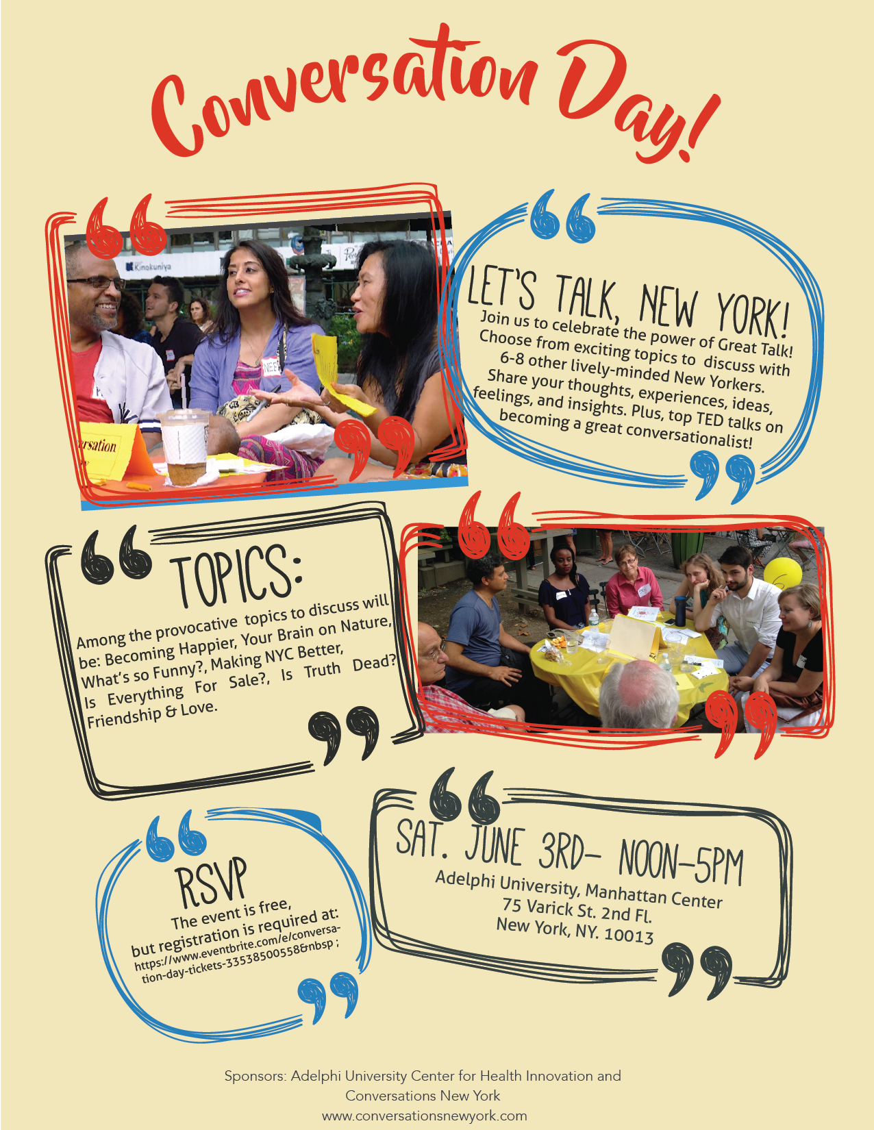 Conversations New York (www.conversationsnewyork.com) is a community of volunteers which has promoted more and better conversations among New Yorkers by such activities as quarterly CONVERSATION DAYS, these monthly Conversations, an on-line calendar featuring 1,000 conversations a year, and the first national symposium on The Power of Conversation, held at Columbia University.